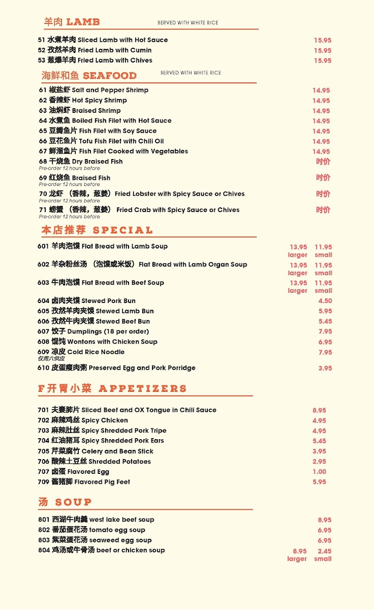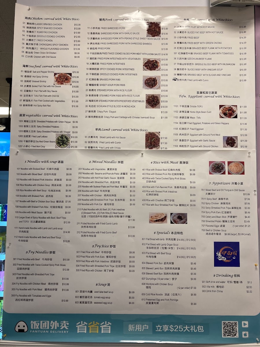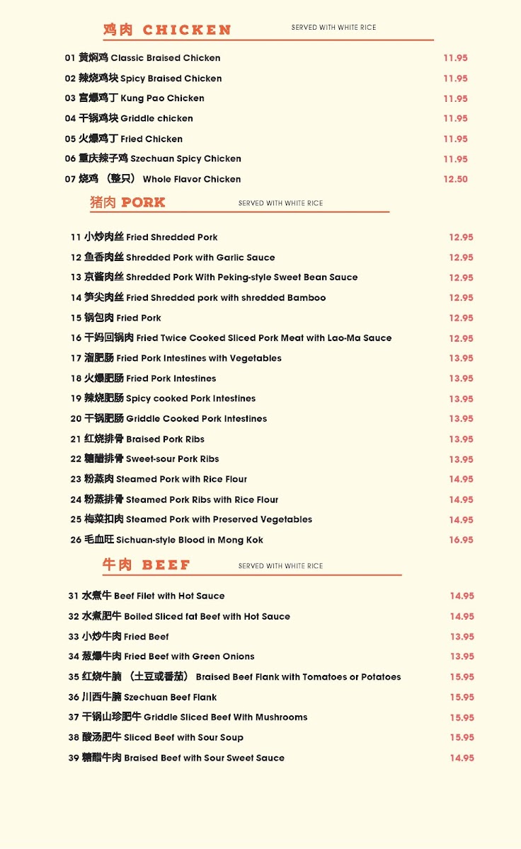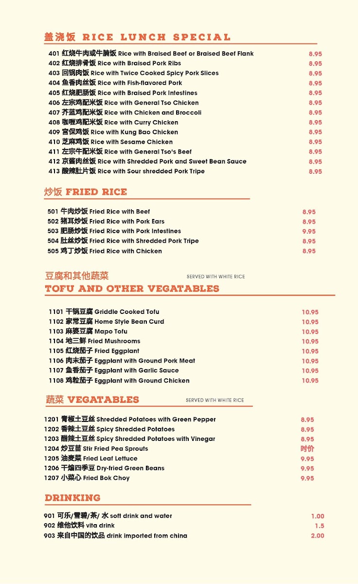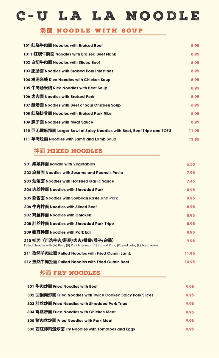 From a reviewer’s perspective, the menu at C‑U La La Noodle truly reflects the depth and comfort of traditional Chinese cuisine while still offering plenty of variety for different tastes. The restaurant shines with its extensive noodle selection, from Braised Pork Pulled Noodle, Stewed Lamb Pulled Noodle, and Stewed Cumin Beef Pulled Noodle to comforting soup options like Noodles W. Braised Beef and Noodle W. Sliced Beef Soup, all of which highlight rich broths and hearty portions. Beyond noodles, the menu expands into satisfying rice dishes such as Rice W. Braised Beef, Rice W. Twice Cooked Spicy Pork Slices, and flavorful fried rice options like Fried Rice W. Beef or Fried Rice W. Pork Ears. Chef-driven items including Flat Bread W. Lamb Soup, Flat Bread W. Lamb Organ Soup, and classic buns like Stewed Pork Bun or Stewed Beef Bun add an authentic, street-food-inspired touch. For those dining in groups or looking for value, combinations such as 2 Items Combo, 3 Items Combo, and curated single set meals pairing porridge, buns, and drinks make the experience convenient and filling. The menu also balances indulgence with variety through bold stir-fried entrées-Kung Pao Chicken, Guo Bao Rou, Fried Lamb W. Cumin-alongside vegetable staples like Spicy Shredded Potatoes and Dry-Fried Green Beans. Rounding things out are comforting soups, classic appetizers, and simple drinks like Cola, Sprite, and Tea, making the menu feel complete and thoughtfully structured. Overall, C-U La La Noodle’s menu successfully brings together noodles, rice, meats, and sides into a cohesive offering that feels both generous and deeply rooted in authentic flavors, leaving diners with a strong sense of satisfaction and plenty of reasons to return.